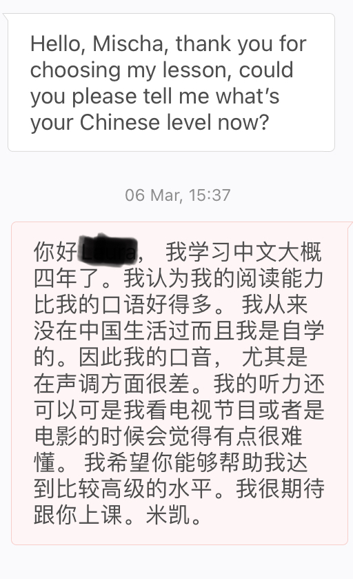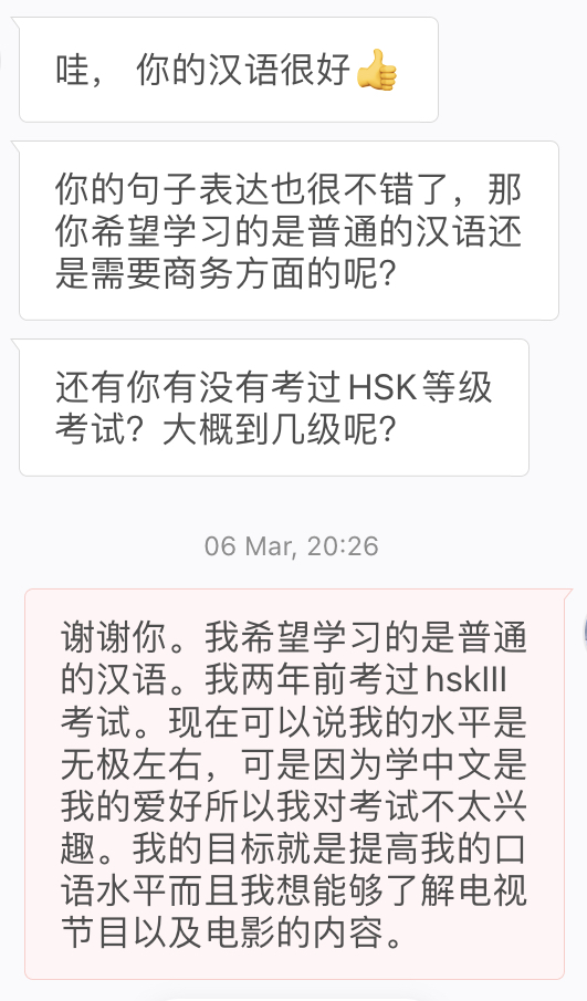 The teacher immediately replied thanking me for booking with her and inquiring about my Chinese level. I replied in Chinese informing her that I had been studying for nearly four years from outside China and that while my listening and reading were OK I still found watching TV and movies hard. I also stated I wanted to work on my spoken Mandarin, especially tones. The tutor then asked me to specify my HSK proficiency level. I replied that I might be around the equivalent of HSK V. I added I had never prepared for this exam, had no interest in proficiency exams and that my main goal was to improve my spoken Mandarin (which this exam doesn’t assess). She replied by saying she understood and that was that.