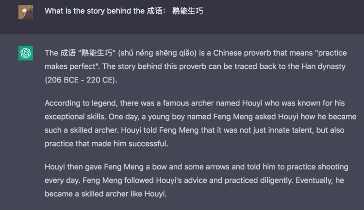 Another novel way of using ChatGPT to help you learn Chinese comes courtesy of Slow Chinese founder, Andrew Methven. Andrew recently tweeted about three ways he uses the website to learn advanced phrases. Number three on his list involves generating the original stories behind Chinese idioms (成语) to help deepen his knowledge of them.