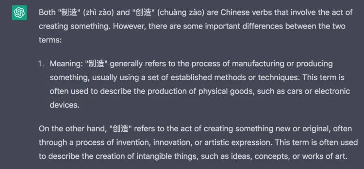 Where I’ve found it to be most reliable is in describing the nuanced differences between two words with similar meanings. For example, I asked it to describe the difference between the words 制造 and 创造. The response (see below) was useful and comprehensive. Although all native speakers know the difference between these two words intuitively, most will not have a detailed and accurate explanation ready to hand.