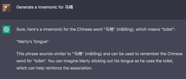 I tested this out for myself. I’ve never used mnemonics before but I can see how they could be useful. You can make up your own mind whether you think the example below would help you remember the word for toilet in Chinese or not. If you’re not satisfied you can always ask it to generate a new one.