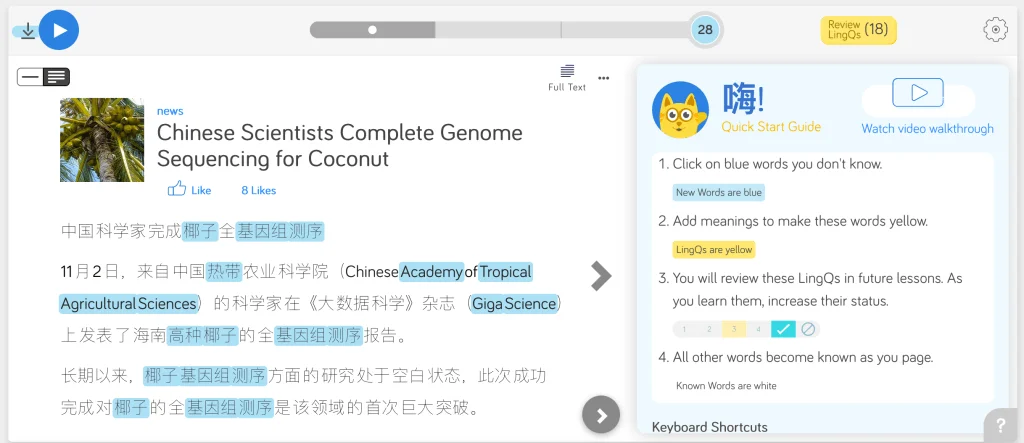 One of my favourite websites is LingQ, as it contains lots of interesting content and allows you to import content from other websites. Using LingQ enabled me to begin tackling semi-native content for the first time: a podcast series that included audio and transcripts of two friends discussing their daily lives in Beijing. The podcast was intended for intermediate learners but the speakers chatted using colloquial Chinese at a natural pace.